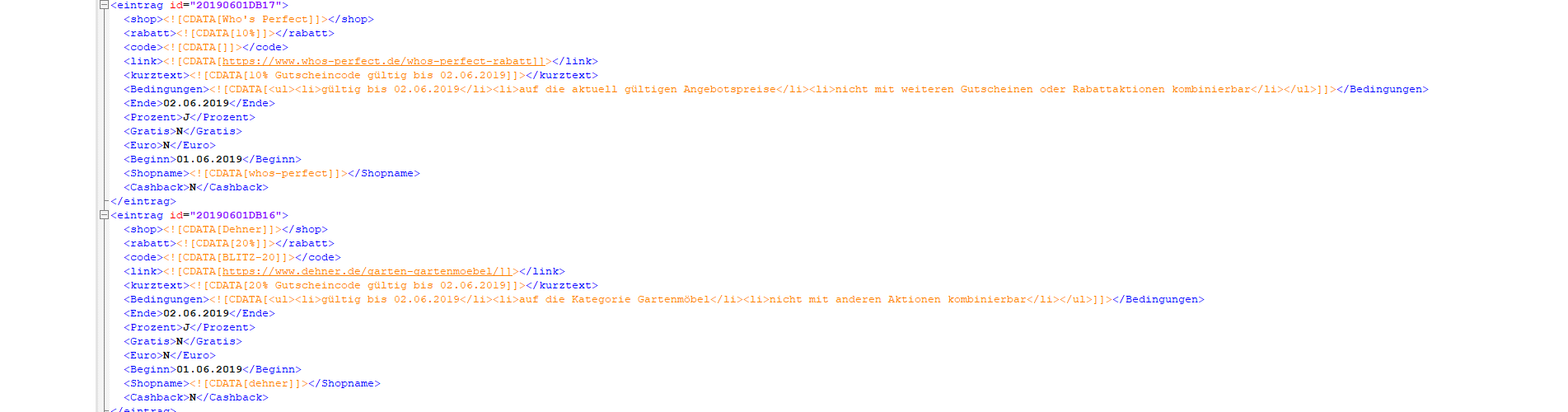Wenn Sie Interesse an der Nutzung unseres Gutschein-Feeds haben, nehmen Sie Kontakt zu uns auf. Nutzen Sie hierfür die Emailadresse im Impressum mit dem Betreff „Integration XML-Gutschein-Feed“. Geben Sie bei der Anfrage unbedingt die URL und die monatlichen Besucherzahlen Ihrer Webseite an. Nach positiver Prüfung Ihrer Webseite (ausgeschlossen sind unfertige Webseiten, rechtlich fragwürdige Inhalte etc.) erhalten Sie die URL des XML-Feeds für die Integration der Gutscheinaktionen und eine technische Beschreibung der Datenfelder.
